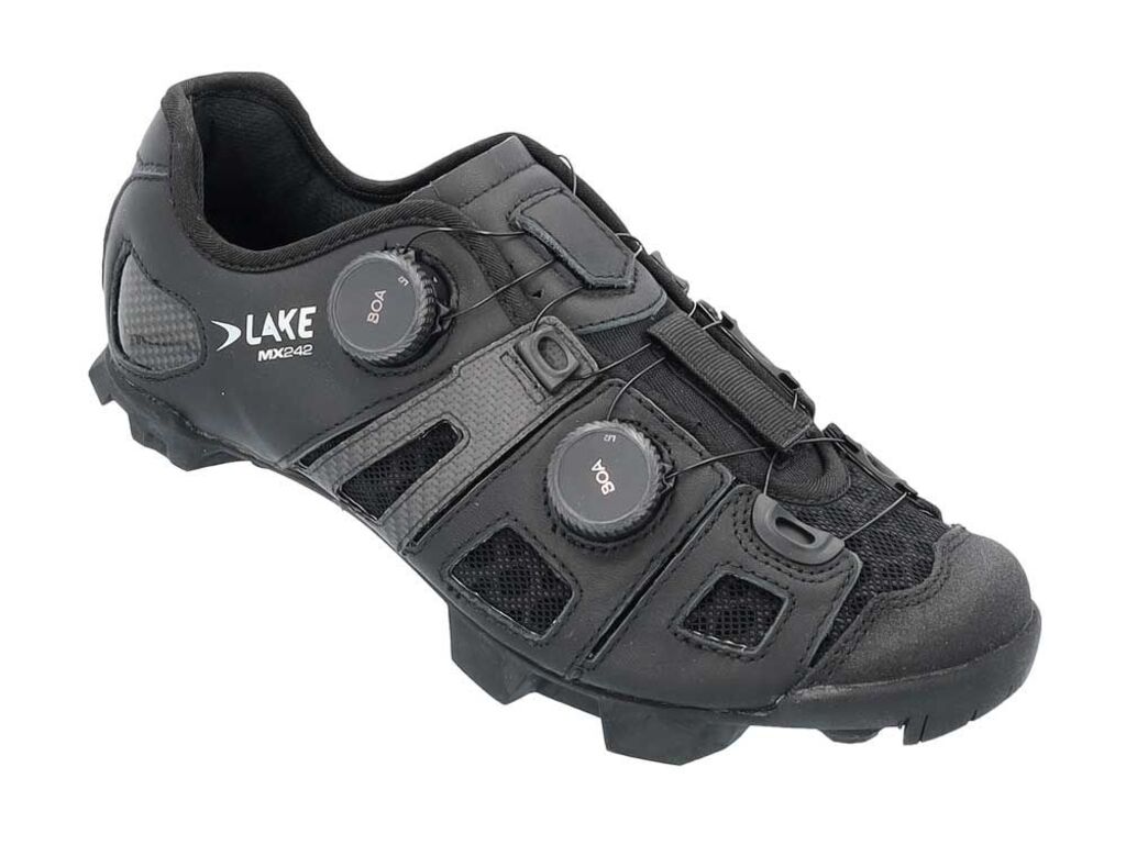 De Lake MX242 is een geweldige schoen! Deze schoen bestaat uit verschillende delen die met een onafhankelijke dubbele Boa zijn aan te trekken of te ontspannen. Dat zorgt ervoor dat eigenlijk iedere voet in deze schoen past. Je kan hem namelijk onafhankelijk stellen en zo op elke plek meer of minder druk creëren. MX Compentition Last Met een profiel dat specifiek is ontworpen voor zeer hoge trapfrequenties en een hogere druk. De Competition schoenleest heeft een meer gebogen profiel dan de Sport schoenleest. De belangrijkste verschillen zijn onder meer een verhoogde teen- en hielzone, een strakkere hak en een iets brede vorm waardoor de voet comfortabel kan uitzetten onder hoge druk tijdens het trappen. Kleuren: Black/Silver-Helcor Bio Camo De MX242 is het resultaat van al Lake’s ervaring, geavanceerde materialen en schoenmaaktechnieken. Dankzij die ervaring is het gelukt om een schoen maken die voor elk voettype de best passende oplossing biedt. De schoen is voorzien van een door warmte vervormbare hielkap en een uniek ontworpen bovenwerk dat voldoende verstelbaar is voor voeten met elke wreefhoogte. De bovenzijde is gemaakt van een zeer stevig leer met NuFoam lining. Die leren buitenzijde is in zes verschillende panelen verdeelt die zo zorgen voor een ideale pasvorm. De zool is van 100% carbon en afgewerkt drie schroefgaten voor schoenplaatjes en rubberen loopstrips. Het afstellen van de schoenen gaat eenvoudig met dubbele Li2 BOA-sluitingen.